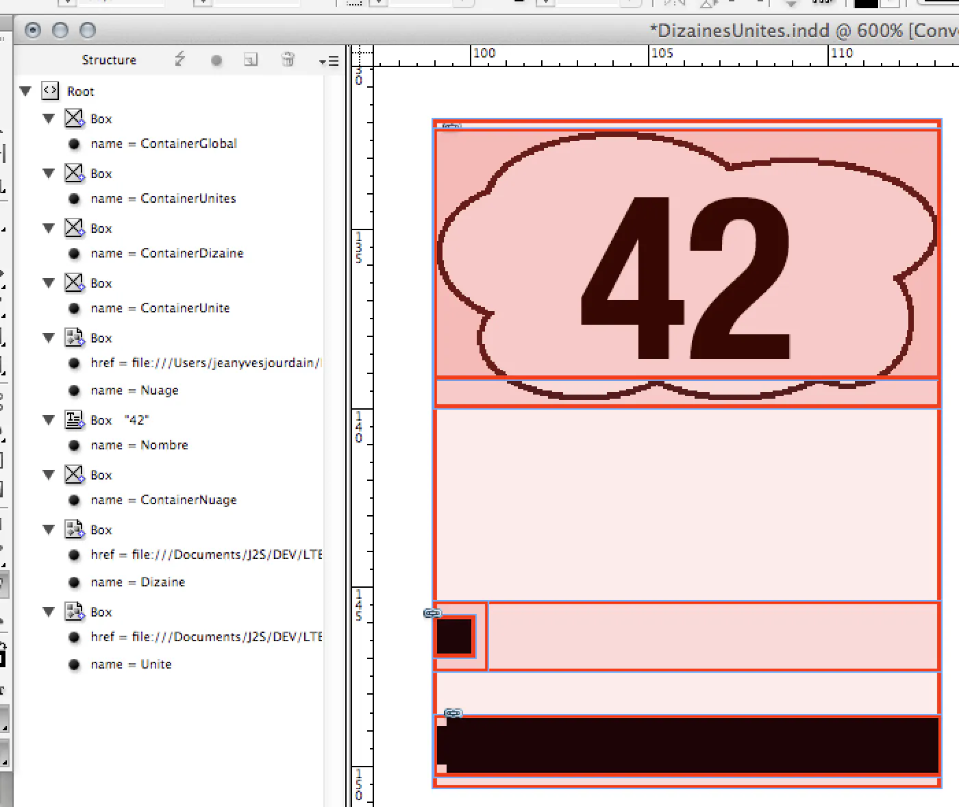 Next to the InDesign file DizainesUnites.indd that I used to make the bricks is an XML file TenUnitSheet.xml, it’s the module – the plan -. In J2S Module Editor, I point to the InDesign file; as there is only one module associated with this file, it is the right one that is directly opened.