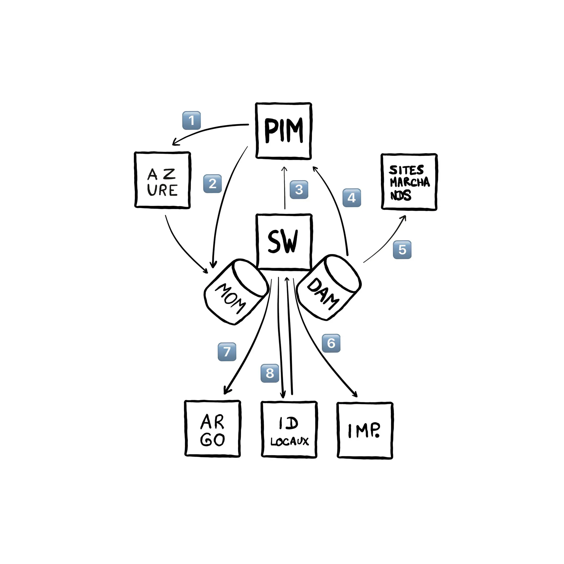 C’est Simple Workspace qui gère le DAM. Mais le PIM a besoin de lier les images aux produits, n’est-ce pas ? Qu’à cela ne tienne, un connecteur est mis en place 4️⃣ : directement à partir de l’interface du PIM, l’utilisateur peut rechercher et voir les images. Enfin, des flux sortants sont mis en place pour alimenter en visuels les sites marchands 5️⃣.