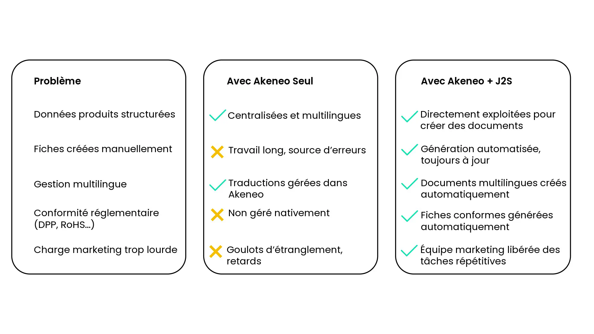 L’intégration d’Akeneo et de J2S offre une multitude d’avantages pour les entreprises cherchant à optimiser leur gestion de l’information produit et leur production documentaire. Voici les principaux bénéfices :